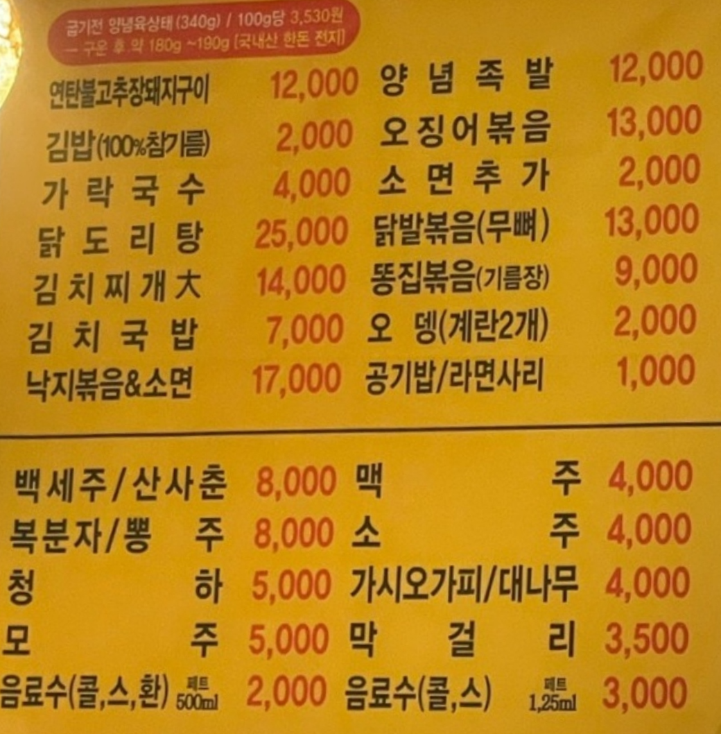 저희는 연탄불고기, 김밥, 어묵, 가락국수를 시켰어요.