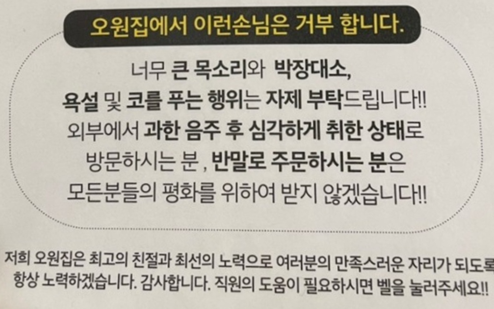 영업시간이 늦은 오후에서부터 새벽시간까지이니 그동안 산전수전공중전 다 겪었을 것 같은 당부멘트를 적어 놓으셨네요.